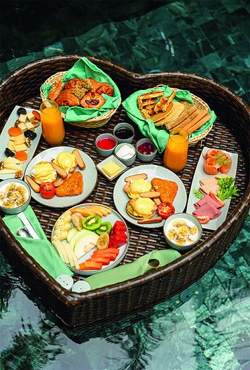 Завтрак в бассейне — конечно, штука для соцсетей. Снять и выложить красивые фото. Но мы хоть перенесли корзину на стол, поймали от этого какой-то романтический вайб — безусловно, есть прелесть в этом.