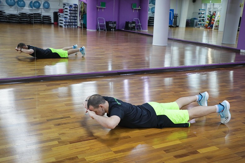 Стартовое положение — лежа на животе, ладони под головой. Сводя лопатки и напрягая мышцы живота, поднимать грудную клетку с пола, оставляя ягодичные мышцы расслабленными. Медленно выполнить 20-25 повторений за подход.