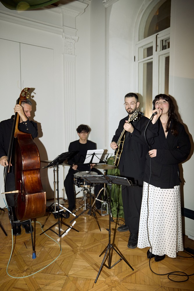 Продолжением вечера стало перемещение на второй этаж — в закрытое пространство, где гостей ждала более иммерсивная часть программы. Живой джаз-бэнд, ретро-фотостудия и открытый номер отеля, стилизованный под предновогоднюю подготовку, стали визуальным и эмоциональным продолжением концепции. Изделия из новой коллекции были разложены на предметах мебели, создавая ощущение, будто праздничные образы уже выбраны и ждут своего выхода.