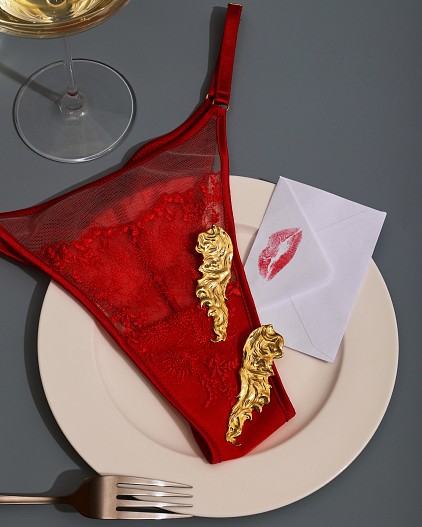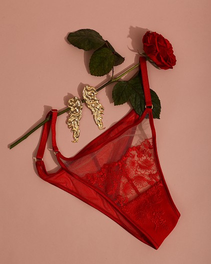 В комплект вошли серьги «Огонь» из коллекции «Жар-птица»: легкие, невесомые и разжигающие страсть. И красные стринги из премиального кружева с вышивкой и мягкой сеткой — с регулировкой размера от XS до L. Они визуально удлиняют ноги и идеально садятся по фигуре.