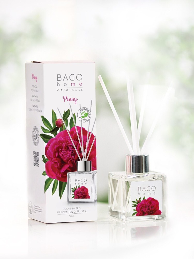 Как и все продукты BAGO home, аромат «Пион» представлен в разных форматах: аромадиффузоры с фибровыми палочками, наполнители для диффузоров и ароматные саше.