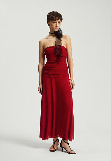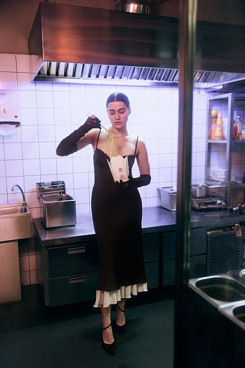 Во второй капсуле Late Dinner акцент сделан на чувственных материалах: сатине, кружеве и полупрозрачных тканях в глубоких оттенках черного, бордового и вишневого. Среди ключевых моделей — корсетные топы, халтеры и платья-комбинации, созданные для эффектных выходов.