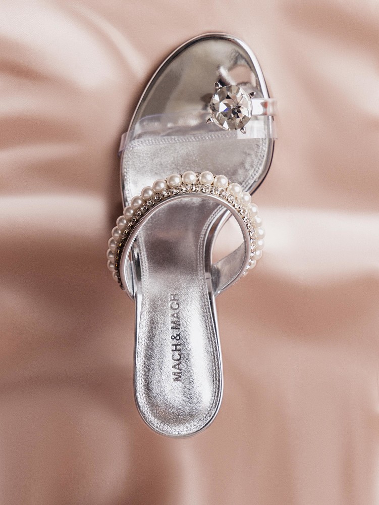 Mach & Mach The Diamond of Elizabeth — эффектные мюли с открытым мысом и кристальной перемычкой между пальцев, которая фиксирует стопу и подчеркивает «ювелирную» стилистику модели. Главный акцент — объемная композиция из крупных жемчужин, превращающая пару в аксессуар уровня украшения.
