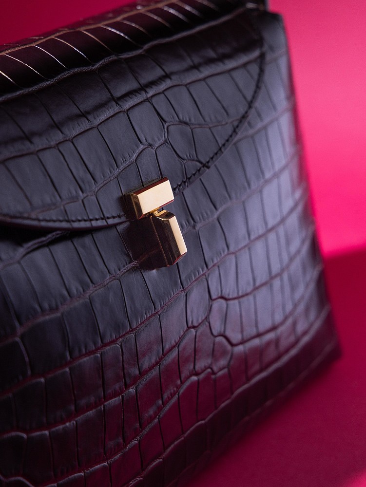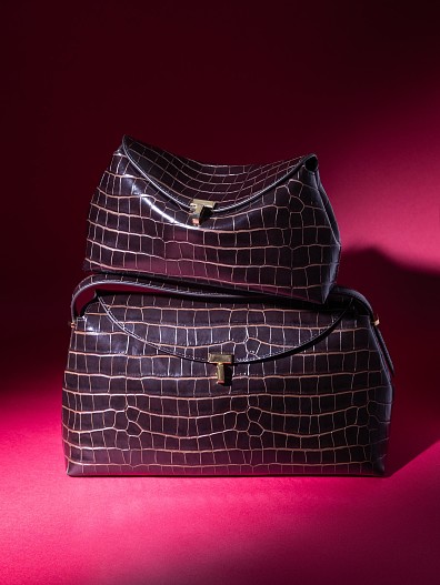T-Lock — знаковая линия сумок TOTEME, названная в честь фирменной поворотной застежки twist clasp и узнаваемая по мягкой скульптурной форме с изогнутым клапаном, который «ложится» под руку. Клатч T-Lock выполнен из тисненой кожи с глянцевым рельефом под аллигатора, за функциональность отвечают дополнительная ручка top-handle и тонкий съемный ремень.