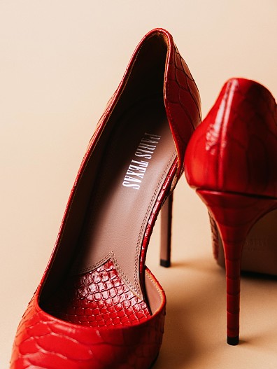 Туфли Vera — это модель из коллекции SS 26 итальянского бренда Paris Texas. Она выполнена из кожи красного цвета с тиснением под питона и оснащена высоким каблуком, так же обтянутым кожей. Интересными деталями дизайна являются острый носок и характерные выемки по внутреннем сторонам модели. Туфли относятся к серии обуви Vera, которое включает в себя как туфли-лодочки, так и ботильоны с разной высотой каблука.